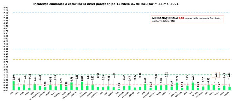 | Nr. crt. | Județ | Număr de cazuri confirmate(total) | Număr de cazuri nou confirmate | Incidența înregistrată la 14 zile |