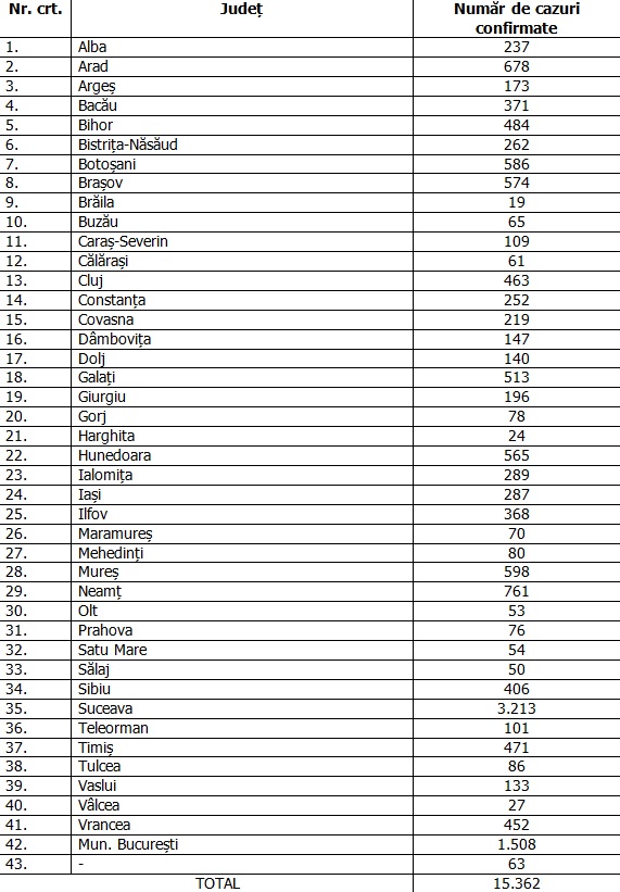 Numărul de cazuri confirmate, pe județe, potrivit raportării Institutului Național de Sănătate Publică: