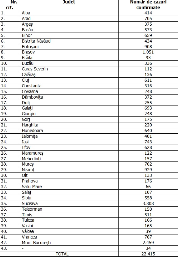 Numărul de cazuri confirmate, pe județe, potrivit raportării Institutului Național de Sănătate Publică: