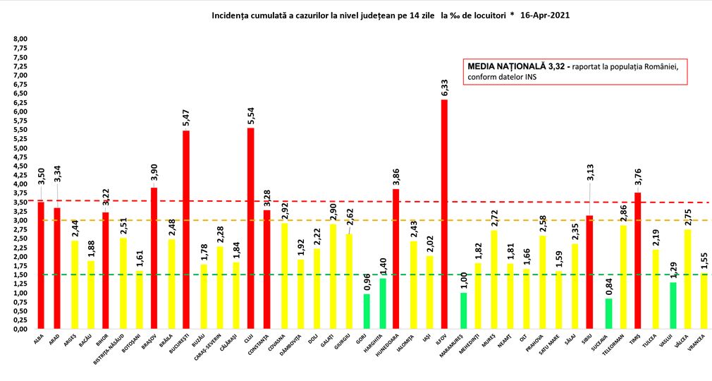 Coeficientul infectărilor cumulate la 14 zile, raportate la 1.000 de locuitori este calculat de către Direcțiile de Sănătate Publică, la nivelul Municipiului București și al județelor. Mai jos aveți graficul realizat în baza raportărilor primite de CNCCI de la Direcțiile de Sănătate Publică: