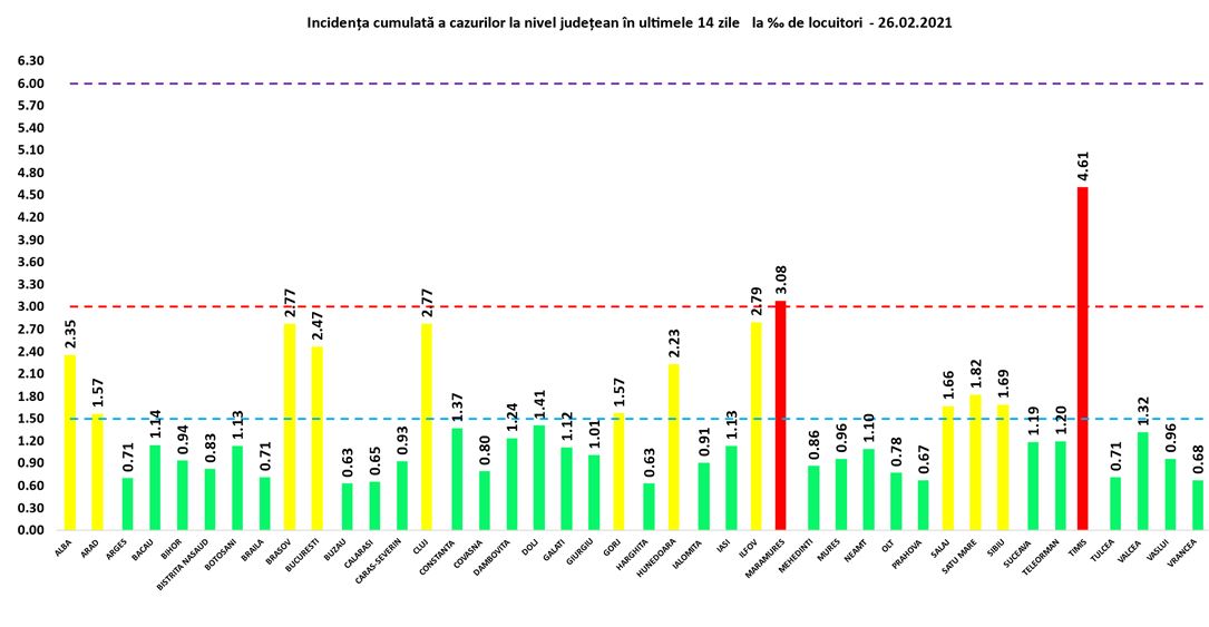 Coeficientul infectărilor cumulate la 14 zile, raportate la 1.000 de locuitori este calculat de către Direcțiile de Sănătate Publică, la nivelul Municipiului București și al județelor. Mai jos aveți graficul realizat în baza raportărilor primite de CNCCI de la Direcțiile de Sănătate Publică: