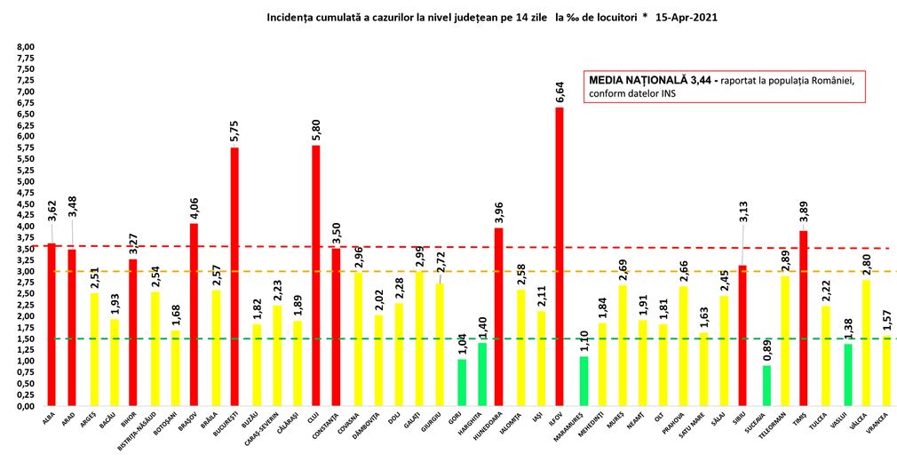 Coeficientul infectărilor cumulate la 14 zile, raportate la 1.000 de locuitori este calculat de către Direcțiile de Sănătate Publică, la nivelul Municipiului București și al județelor. Mai jos aveți graficul realizat în baza raportărilor primite de CNCCI de la Direcțiile de Sănătate Publică:
