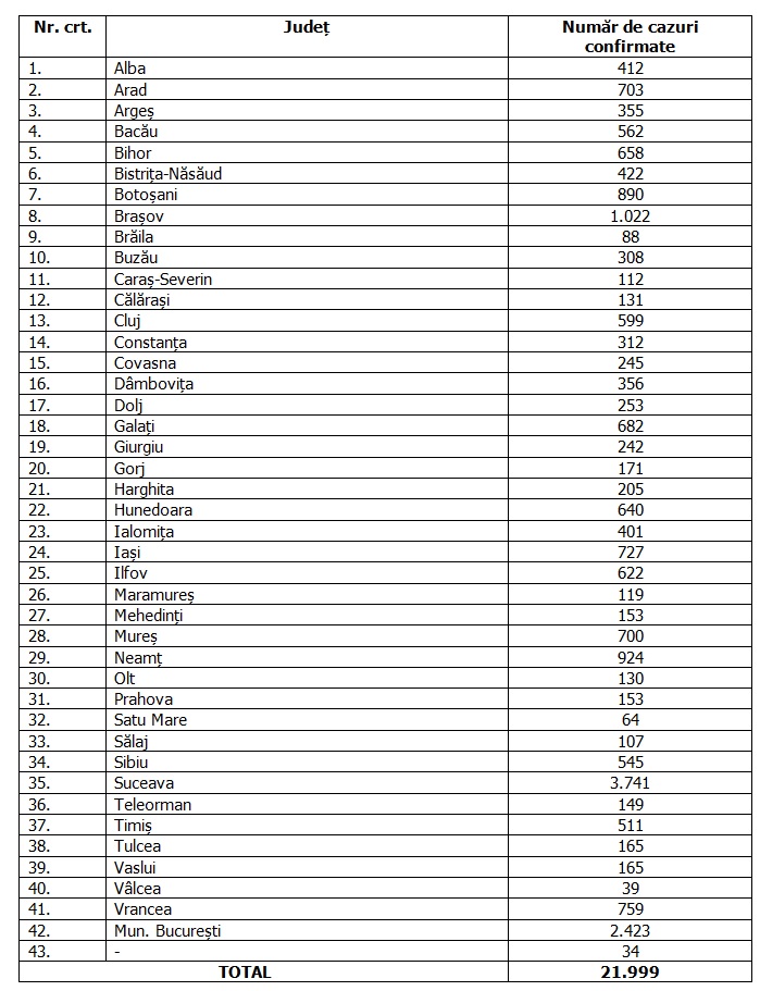 În ultimele 24 de ore, au fost înregistrate 16 decese (9 bărbați și 7 femei), ale unor pacienți infectați cu noul coronavirus, internați în spitalele din Argeș, Bacău, Botoșani, Brașov, Călărași, Cluj, Iași, Olt, Sibiu și Suceava. Dintre acestea, un deces a fost înregistrat la categoria de vârstă 30-39 ani, 1 deces la categoria de vârstă 40-49 ani, 4 decese la categoria de vârstă 50-59 ani, 4 decese la categoria de vârstă 60-69 ani, 4 decese la categoria de vârstă 70-79 ani și 2 decese la persoane de peste 80 de ani.