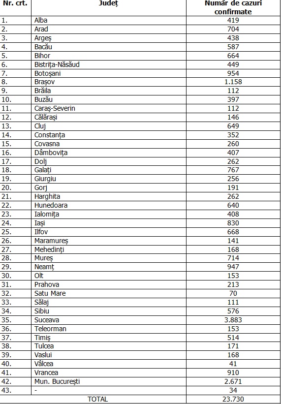 Numărul de cazuri confirmate, pe județe, potrivit raportării Institutului Național de Sănătate Publică: