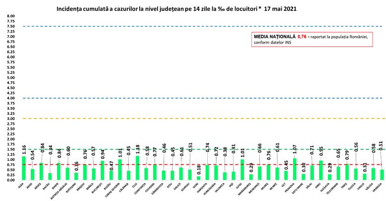 Coeficientul infectărilor cumulate la 14 zile, raportate la 1.000 de locuitori este calculat de către Direcțiile de Sănătate Publică, la nivelul Municipiului București și al județelor. Mai jos aveți graficul realizat în baza raportărilor primite de CNCCI de la Direcțiile de Sănătate Publică: