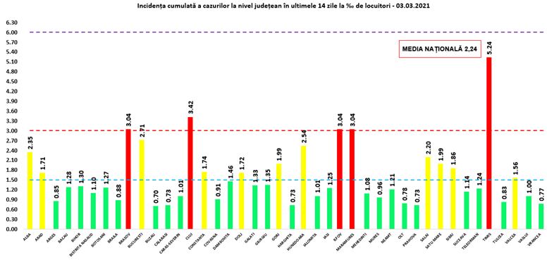 Coeficientul infectărilor cumulate la 14 zile, raportate la 1.000 de locuitori este calculat de către Direcțiile de Sănătate Publică, la nivelul Municipiului București și al județelor. Mai jos aveți graficul realizat în baza raportărilor primite de CNCCI de la Direcțiile de Sănătate Publică: