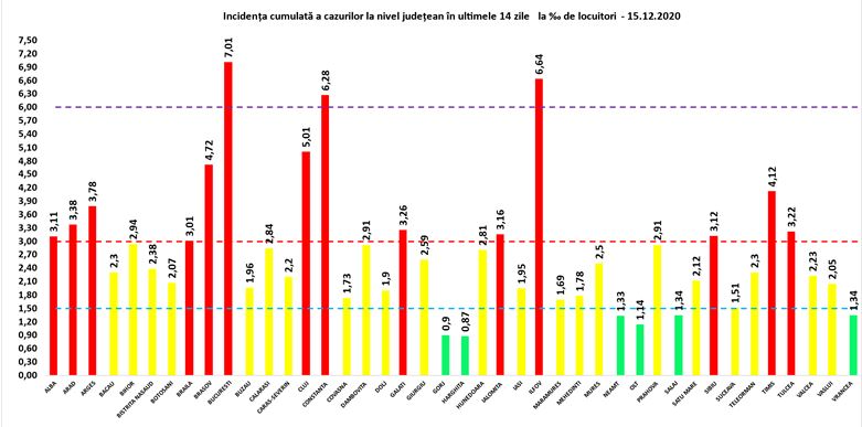 Coeficientul infectărilor cumulate la 14 zile, raportate la 1.000 de locuitori este calculat de către Direcțiile de Sănătate Publică, la nivelul Municipiului București și al județelor. Mai jos aveți graficul realizat în baza raportărilor primite de CNCCI de la Direcțiile de Sănătate Publică: