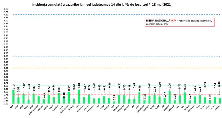 Coeficientul infectărilor cumulate la 14 zile, raportate la 1.000 de locuitori este calculat de către Direcțiile de Sănătate Publică, la nivelul Municipiului București și al județelor. Mai jos aveți graficul realizat în baza raportărilor primite de CNCCI de la Direcțiile de Sănătate Publică: