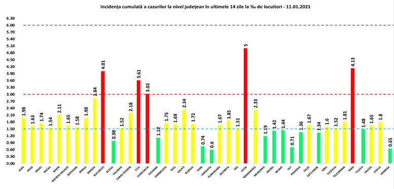 Coeficientul infectărilor cumulate la 14 zile, raportate la 1.000 de locuitori este calculat de către Direcțiile de Sănătate Publică, la nivelul Municipiului București și al județelor. Mai jos aveți graficul realizat în baza raportărilor primite de CNCCI de la Direcțiile de Sănătate Publică:
