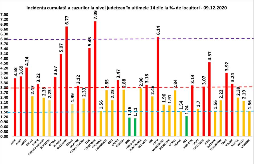 Coeficientul infectărilor cumulate la 14 zile, raportate la 1.000 de locuitori este calculat de către Direcțiile de Sănătate Publică, la nivelul Municipiului București și al județelor. Mai jos aveți graficul realizat în baza raportărilor primite de CNCCI de la Direcțiile de Sănătate Publică: