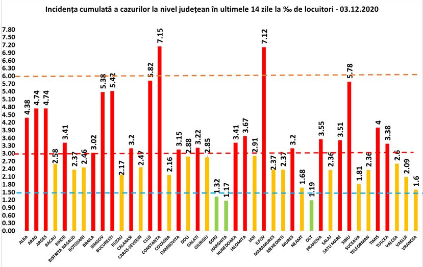 Coeficientul infectărilor cumulate la 14 zile, raportate la 1.000 de locuitori este calculat de către Direcțiile de Sănătate Publică, la nivelul Municipiului București și al județelor. Mai jos aveți graficul realizat în baza raportărilor primite de CNCCI de la Direcțiile de Sănătate Publică: