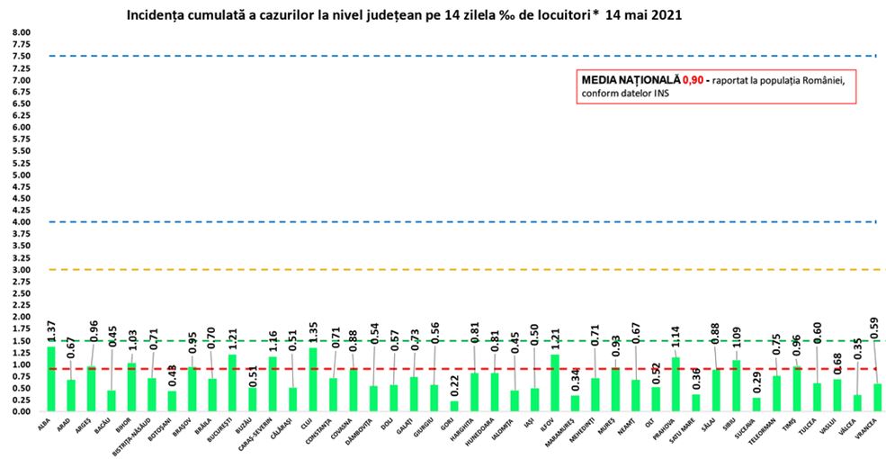 Coeficientul infectărilor cumulate la 14 zile, raportate la 1.000 de locuitori este calculat de către Direcțiile de Sănătate Publică, la nivelul Municipiului București și al județelor. Mai jos aveți graficul realizat în baza raportărilor primite de CNCCI de la Direcțiile de Sănătate Publică: