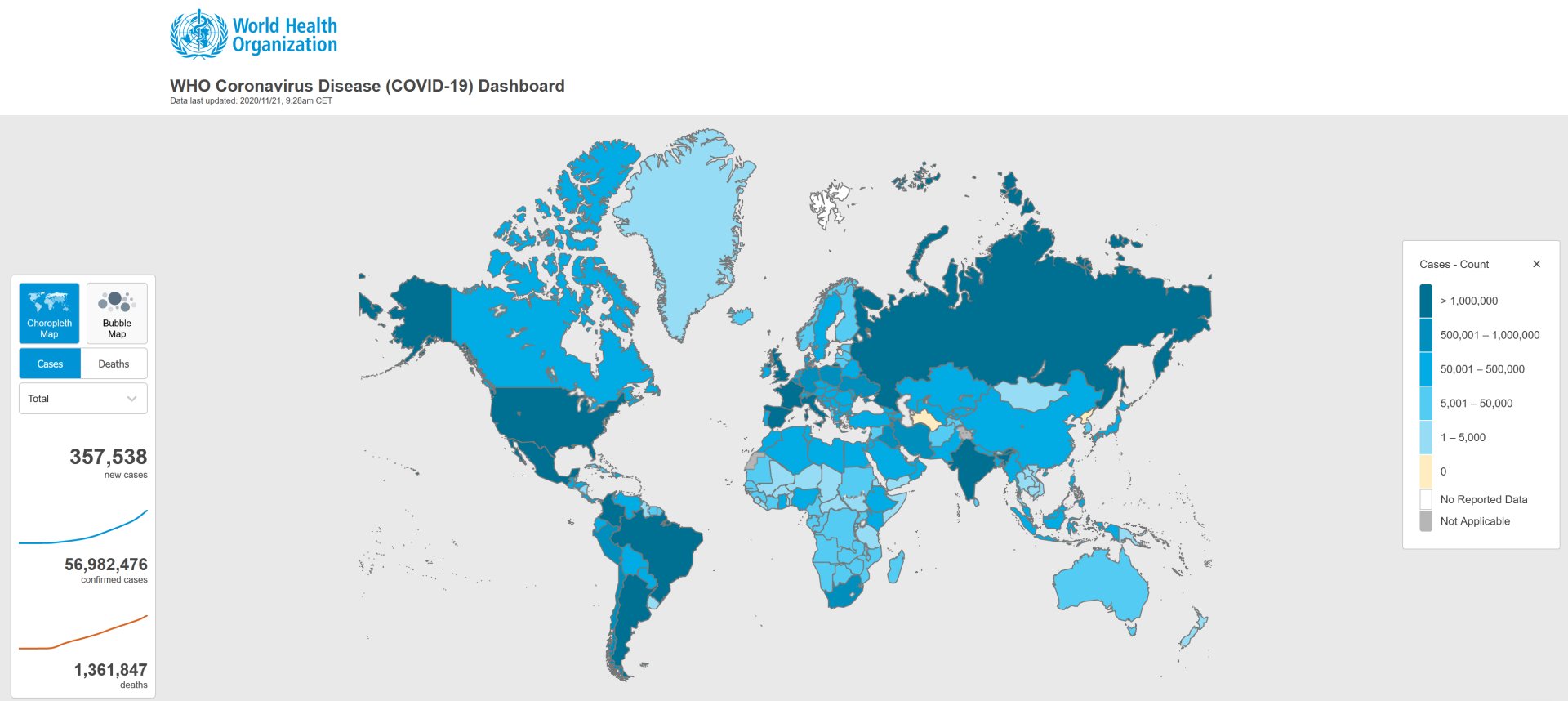 OMS anunță un bilanț internațional de 56.982.476 cazuri confirmate de COVID-19, între care 1.361.847 decese.