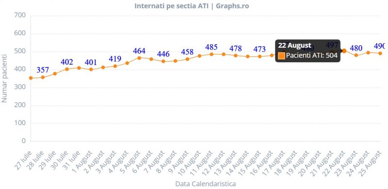 Inițial, pe 2 august, numărul pacienților aflați în stare gravă atingea un nou record – 412, după care a crescut constant, până pe 5 august, când a urcat la 464. După o pauză de două zile, numărul pacienților de la ATI a crescut constant pe parcursul lunii august, cel mai mare nivel fiind atins pe 22 august – 504.