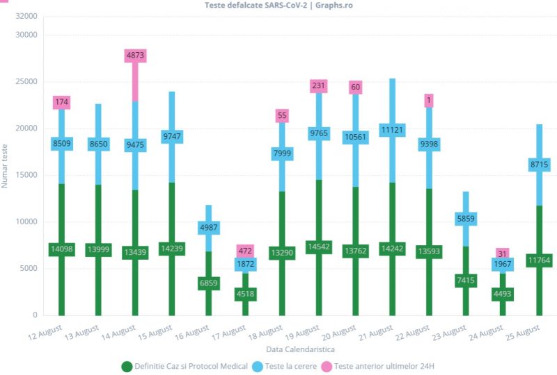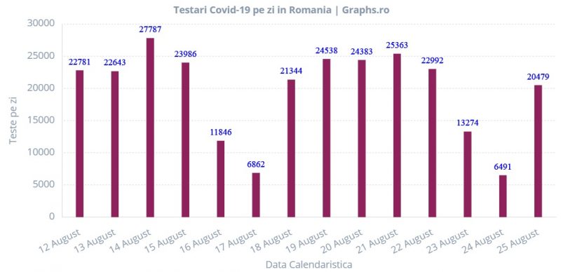 Explicația este dată și de numărul foarte mic de teste realizate sâmbătă (doar 13.274 de teste) și duminică (doar 6.491 de teste).