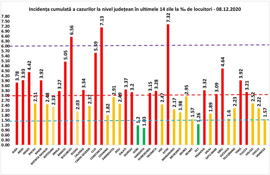 Coeficientul infectărilor cumulate la 14 zile, raportate la 1.000 de locuitori este calculat de către Direcțiile de Sănătate Publică, la nivelul Municipiului București și al județelor. Mai jos aveți graficul realizat în baza raportărilor primite de CNCCI de la Direcțiile de Sănătate Publică: