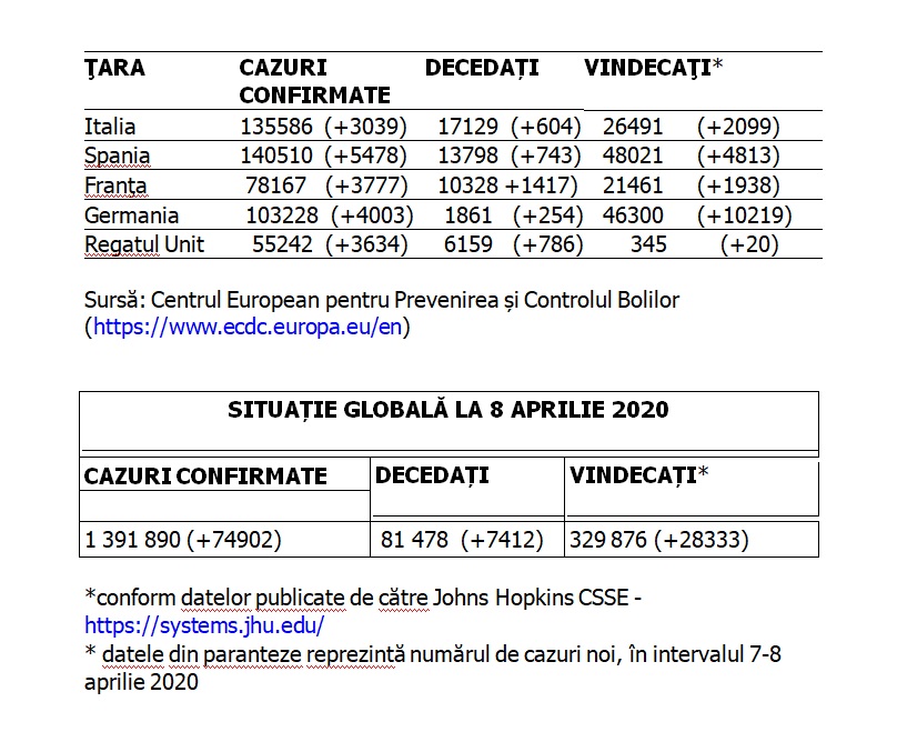 Potrivit informațiilor obținute de misiunile diplomatice și oficiile consulare ale României, în străinătate, 679 de cetățeni români sunt în continuare confirmați ca fiind infectați cu COVID-19 (coronavirus): 418 în Italia, 196 în Spania, 16 în Franța, 9 în Germania, 32 în Marea Britanie, 2 în Namibia, 2 în SUA și câte unul în Irlanda, Luxemburg, Belgia și Suedia. De la începutul epidemiei de COVID-19 și până la acest moment, 38 de cetățeni români aflați au decedat în străinătate (11 în Italia, 7 în Franța, 11 în Marea Britanie, 6 în Spania, 2 în Germania și unul în Suedia). Cetățenii români confirmați cu noul coronavirus în Tunisia și Indonezia au fost declarați vindecați.