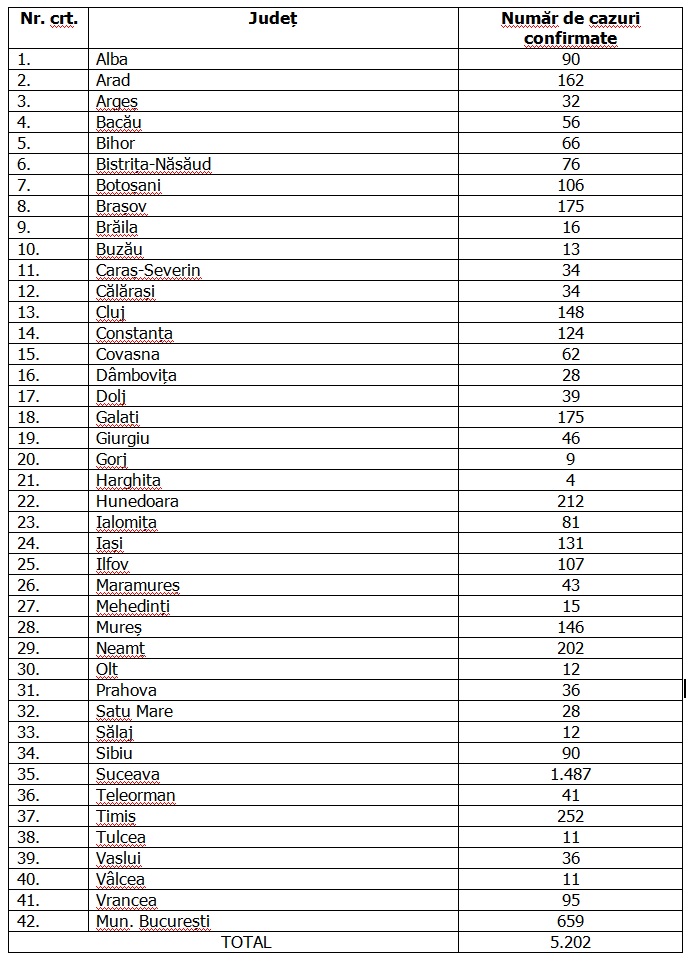 Grupul de Comunicare Strategică a anunțat, joi, că numărul infectărilor cu noul coronavirus a ajuns la 5.202 în România, în creștere cu 441 față de raportarea precedentă.