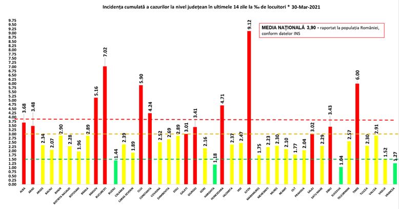 Coeficientul infectărilor cumulate la 14 zile, raportate la 1.000 de locuitori este calculat de către Direcțiile de Sănătate Publică, la nivelul Municipiului București și al județelor. Mai jos aveți graficul realizat în baza raportărilor primite de CNCCI de la Direcțiile de Sănătate Publică: