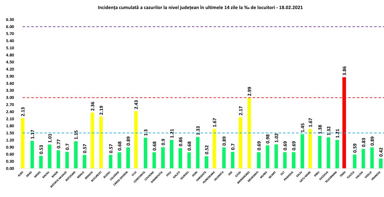 Coeficientul infectărilor cumulate la 14 zile, raportate la 1.000 de locuitori este calculat de către Direcțiile de Sănătate Publică, la nivelul Municipiului București și al județelor. Mai jos aveți graficul realizat în baza raportărilor primite de CNCCI de la Direcțiile de Sănătate Publică: