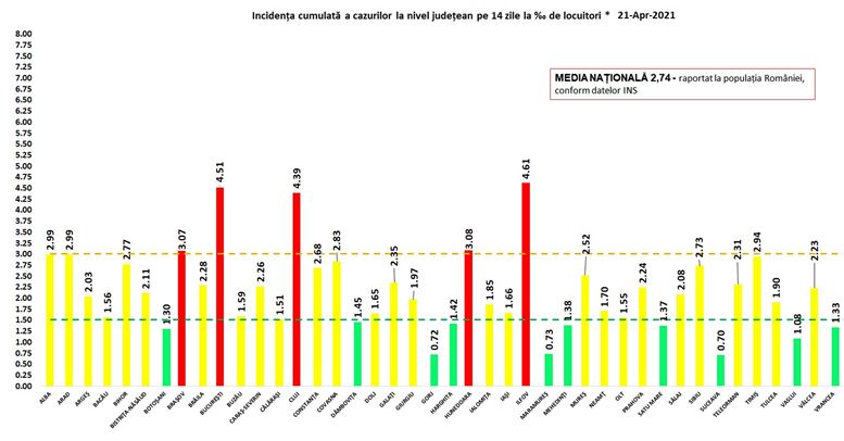 Coeficientul infectărilor cumulate la 14 zile, raportate la 1.000 de locuitori este calculat de către Direcțiile de Sănătate Publică, la nivelul Municipiului București și al județelor. Mai jos aveți graficul realizat în baza raportărilor primite de CNCCI de la Direcțiile de Sănătate Publică: