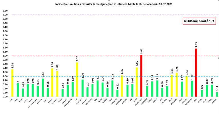 Coeficientul infectărilor cumulate la 14 zile, raportate la 1.000 de locuitori este calculat de către Direcțiile de Sănătate Publică, la nivelul Municipiului București și al județelor. Mai jos aveți graficul realizat în baza raportărilor primite de CNCCI de la Direcțiile de Sănătate Publică: