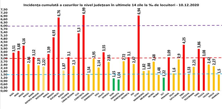 Coeficientul infectărilor cumulate la 14 zile, raportate la 1.000 de locuitori este calculat de către Direcțiile de Sănătate Publică, la nivelul Municipiului București și al județelor. Mai jos aveți graficul realizat în baza raportărilor primite de CNCCI de la Direcțiile de Sănătate Publică: