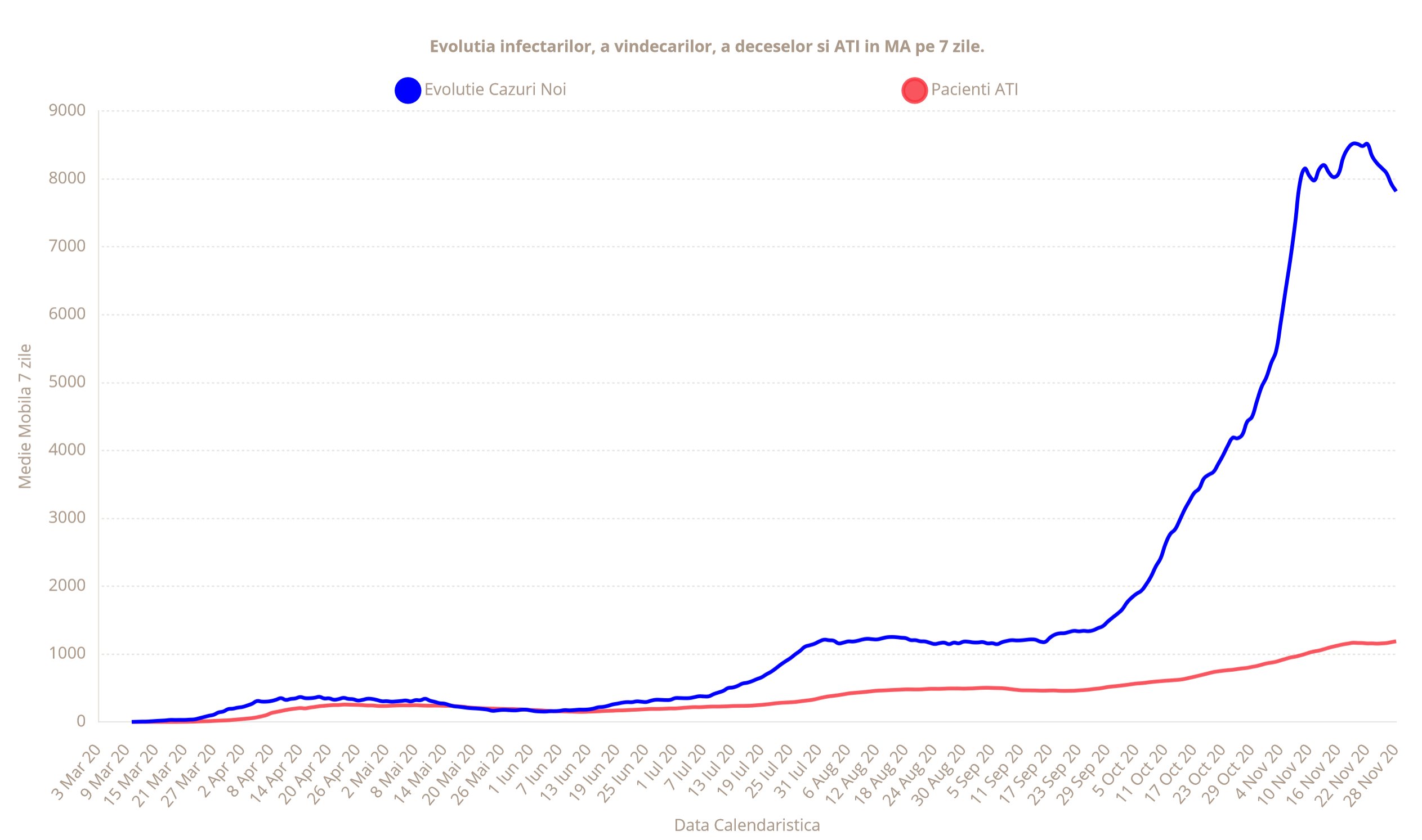 În intervalul 27.11.2020 (10:00) – 28.11.2020 (10:00) au fost raportate 161 de decese (94 bărbați și 67 femei), ale unor pacienți infectați cu noul coronavirus, internați în spitalele Alba, Argeș, Arad, Bacău, Bistrița-Năsăud, Bihor, Botoșani, Brăila, Brașov, Călărași, Caraș-Severin, Cluj, Constanța, Covasna, Dâmbovița, Dolj, Galați, Gorj, Harghita, Hunedoara, Iași, Maramureș, Mehedinți, Neamț, Olt, Prahova, Satu Mare, Sibiu, Suceava, Timiș, Tulcea, Vaslui, Vrancea și Municipiul București.