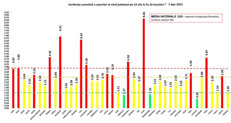 Coeficientul infectărilor cumulate la 14 zile, raportate la 1.000 de locuitori este calculat de către Direcțiile de Sănătate Publică, la nivelul Municipiului București și al județelor. Mai jos aveți graficul realizat în baza raportărilor primite de CNCCI de la Direcțiile de Sănătate Publică: