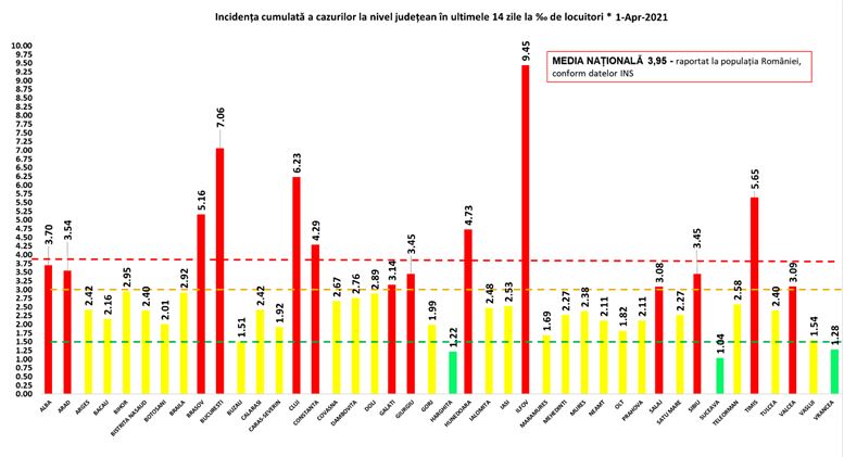 Coeficientul infectărilor cumulate la 14 zile, raportate la 1.000 de locuitori este calculat de către Direcțiile de Sănătate Publică, la nivelul Municipiului București și al județelor. Mai jos aveți graficul realizat în baza raportărilor primite de CNCCI de la Direcțiile de Sănătate Publică: