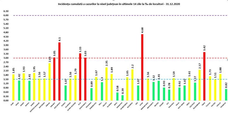 Coeficientul infectărilor cumulate la 14 zile, raportate la 1.000 de locuitori este calculat de către Direcțiile de Sănătate Publică, la nivelul Municipiului București și al județelor. Mai jos aveți graficul realizat în baza raportărilor primite de CNCCI de la Direcțiile de Sănătate Publică: