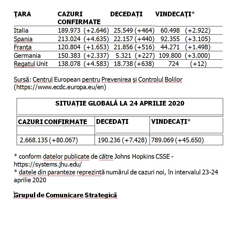 De la începutul pandemiei, au murit 73 de cetățeni români aflați în străinătate (19 în Italia, 16 în Franța, 23 în Marea Britanie, 7 în Spania, 3 în Germania, 2 în Belgia, unul în Suedia, unul în Elveția și unul în SUA).