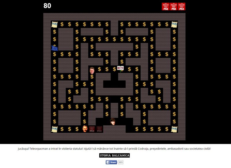 Cel mai nou joc online în care este ironizat Liviu Dragnea, apărut joi , se numește Teleorpacman și este inspirat din celebrul joc al anilor 90, Pacman. Presupune ca, din tastatură, să-l îndrumi pe Liviu Dragnea să culeagă cât mai mulți bani și să se ferească de alte 4 personaje: Laura Codruța Koveși, președintele Iohannis, Uniunea Europeană și o pancartă pe care scrie Hoții.