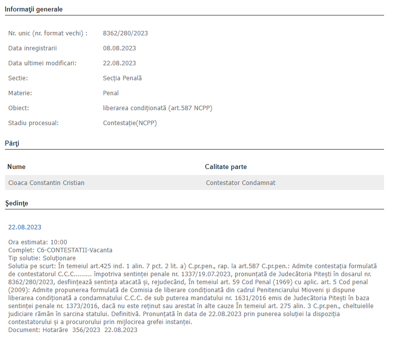 Cristian Cioacă va fi eliberat din închisoare. Tribunalul Argeș a decis – definitiv – să îi admită contestația la decizia Judecătoriei Pitești, care îi respinsese solicitarea de a fi pus în libertate. Cristian Cioacă a fost condamnat la 15 ani și 8 luni de închisoare cu executare în cazul dispariției Elodiei Ghinescu. El primise răspuns pozitiv din partea comisiei pentru eliberare condiționată a Penitenciarului Mioveni.