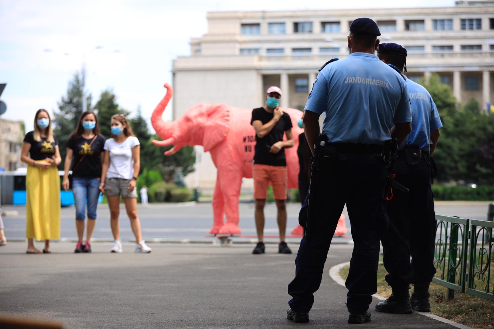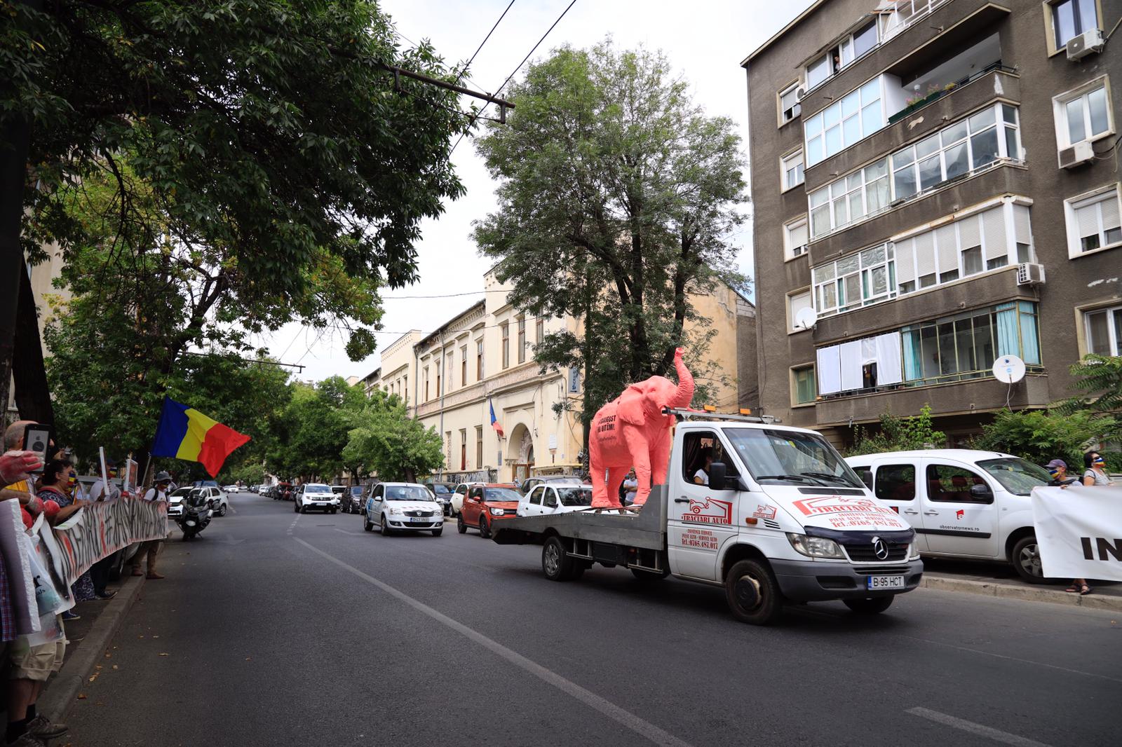 Elefantul vopsit în roz a fost plimbat mai întâi la Palatul Cotroceni, apoi la Parchetul General, Ministerul Justiției și Ministerul de Interne. În fața Ministerului de Interne, jandarmii au blocat elefantul timp de 30 de minute.