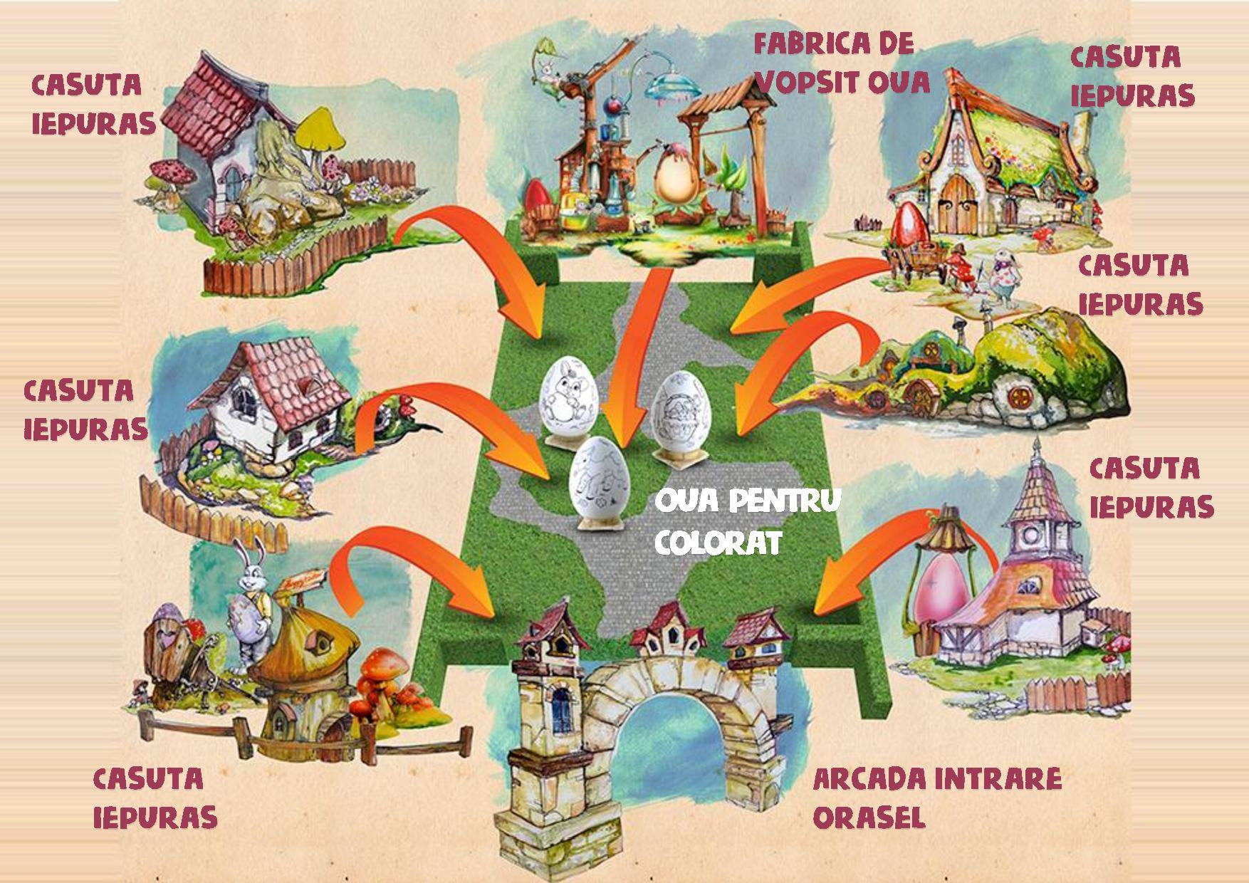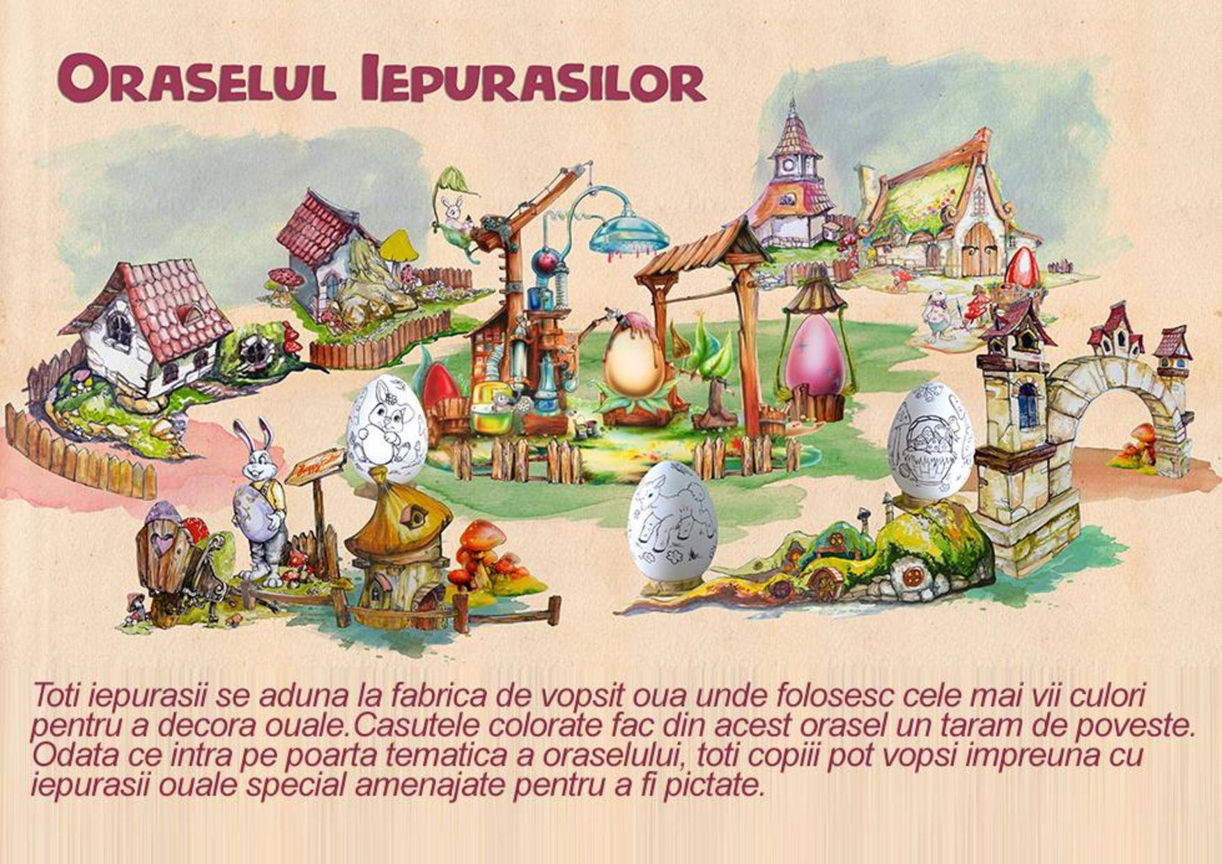 Sunt figurine ce reprezintă o familie de iepurași, ouă roșii vopsite de ”urecheați”, miei și mai multe ciupercuțe, între care una cu ușă și geamuri, ca o căsuță.
