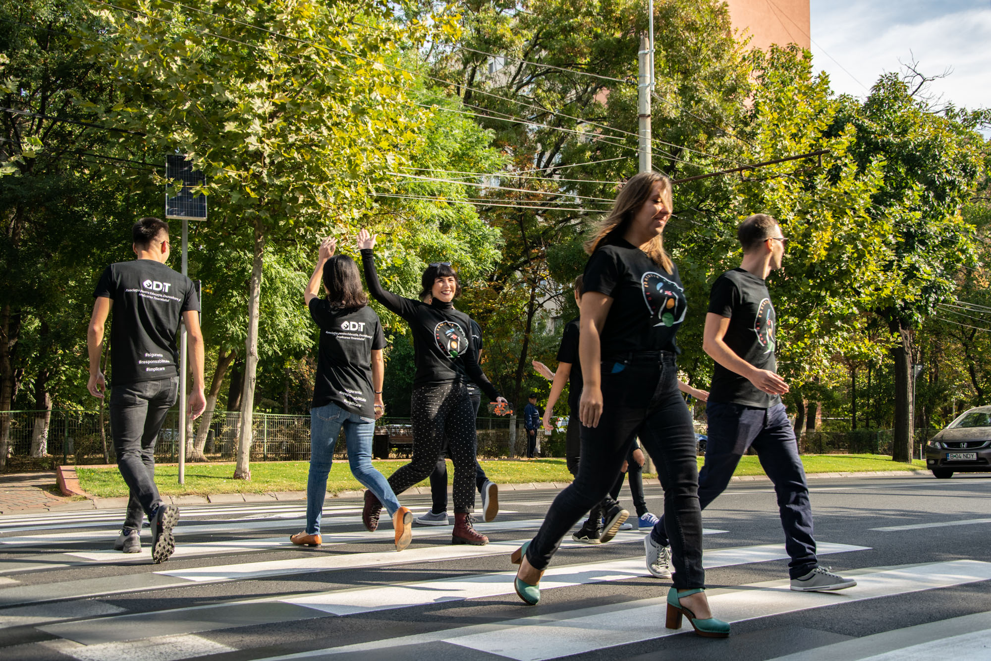 Îmbrăcăți în negru, membrii din Asociația EDIT au traversat de mai multe ori pe trecerea 3D tocmai pentru a trage un semnal de alarmă asupra faptului că cele mai multe accidente în care sunt implicați copiii se întâmplă în jurul școlilor și pe trecerile pentru pietoni.