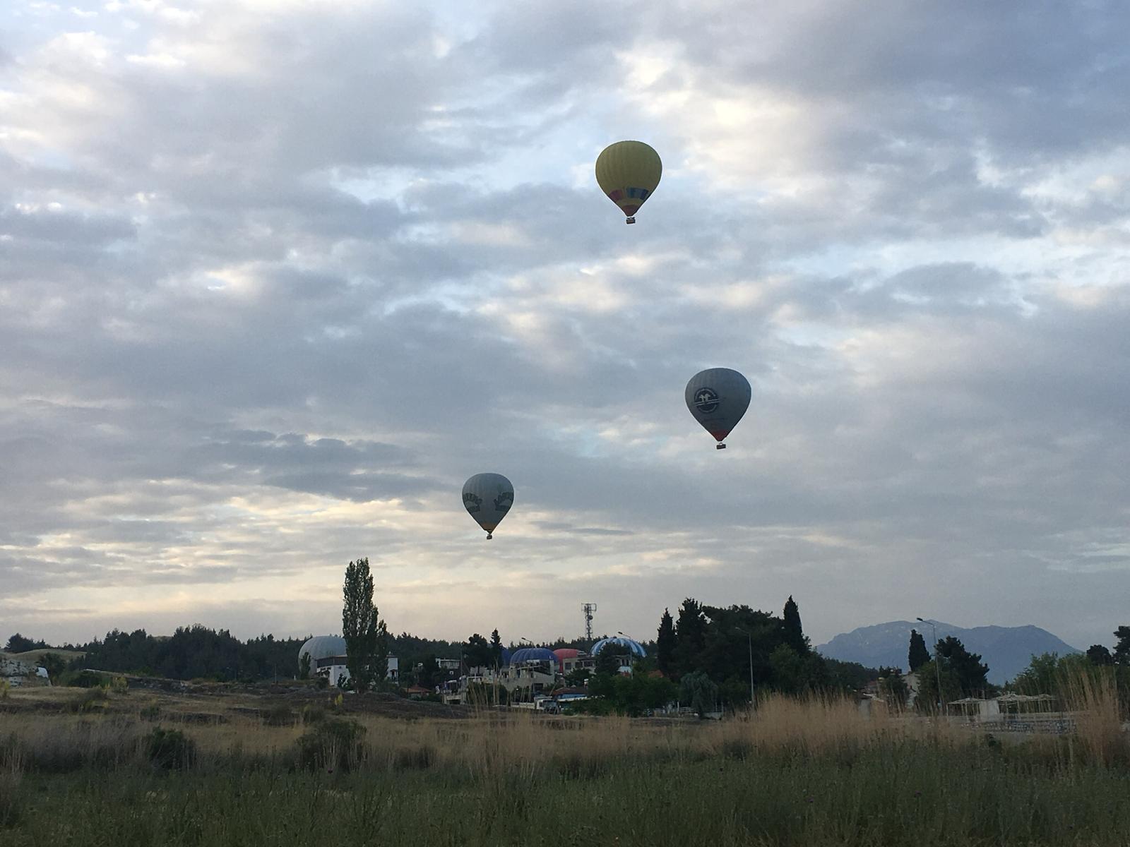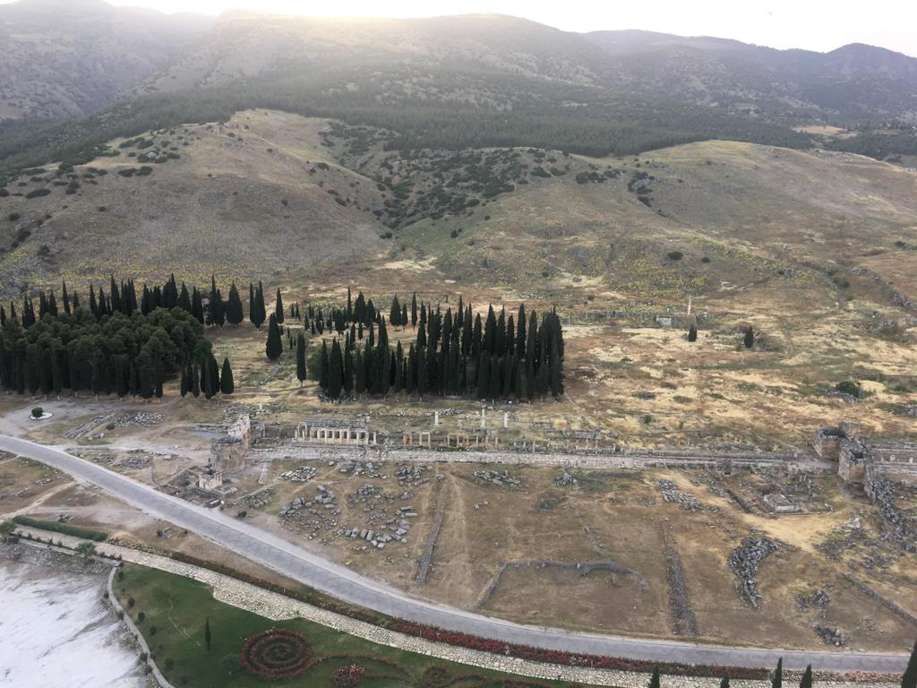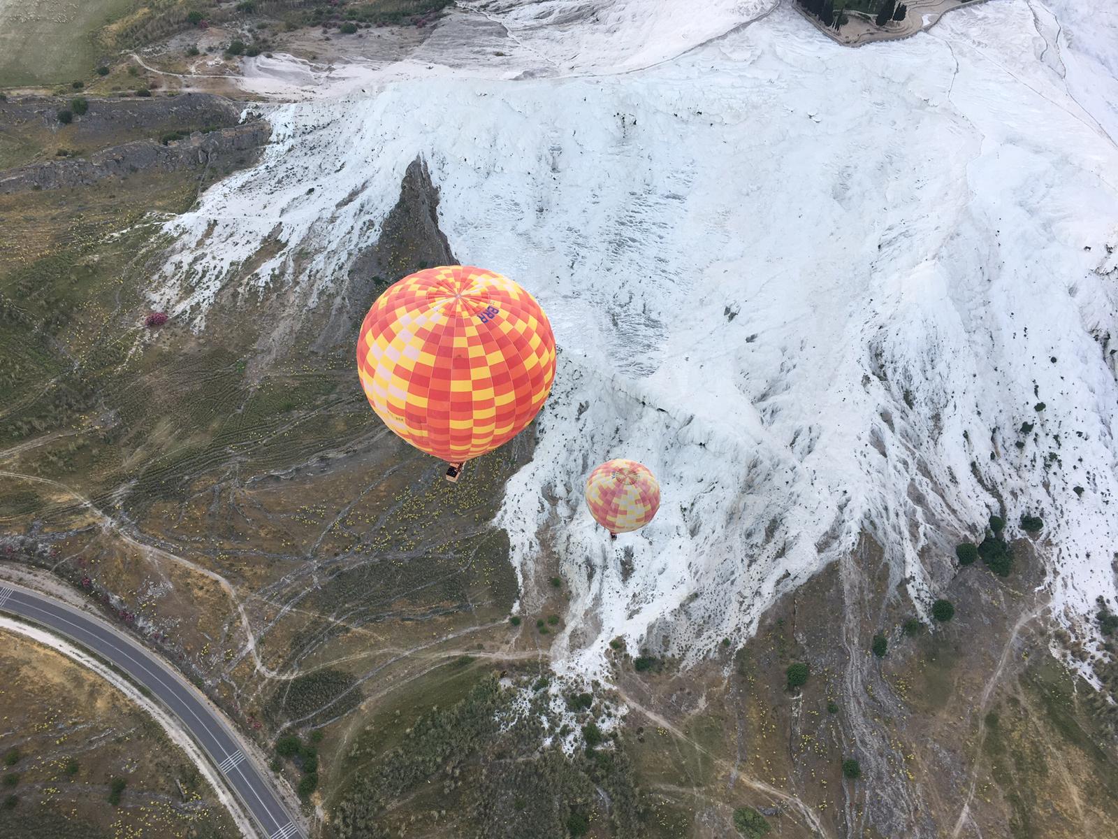 Balonul se ridică deasupra platoului de calcar alb ca zăpada, format din bazine terasate şi stalactite, care au primit denumirea de “Castelul de bumbac”. Peisajul se completează cu oraşul antic Hierapolis.