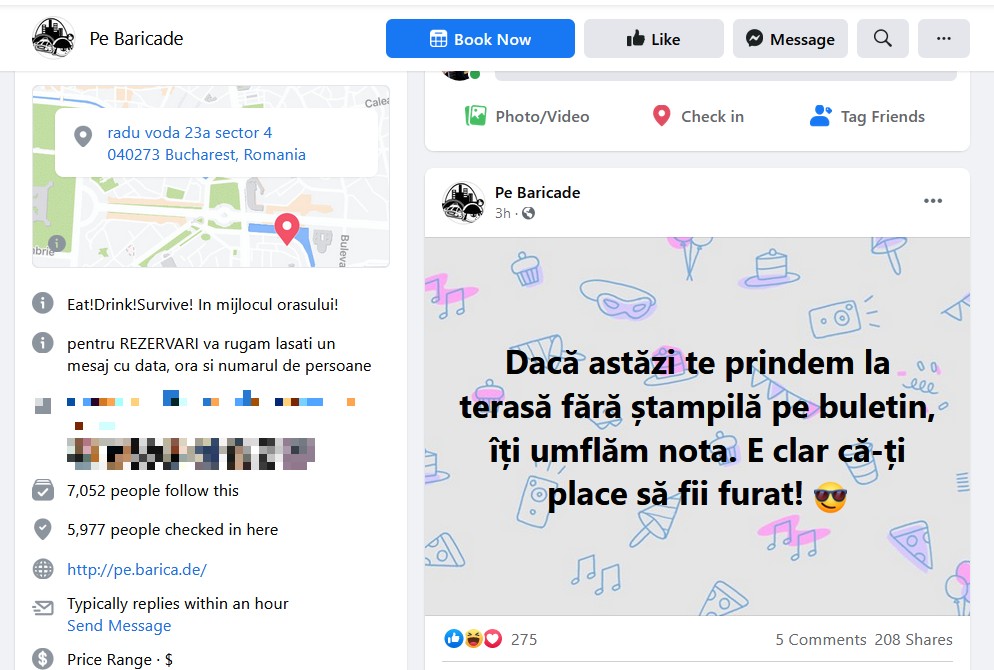 O terasă din București a ales să încurajeze exprimarea votului cu ajutorul unei glume legate de nota de plată – ”Dacă astăzi te prindem la terasă fără ștampilă pe buletin, îți umflăm nota. E clar că-ți place să fii furat”