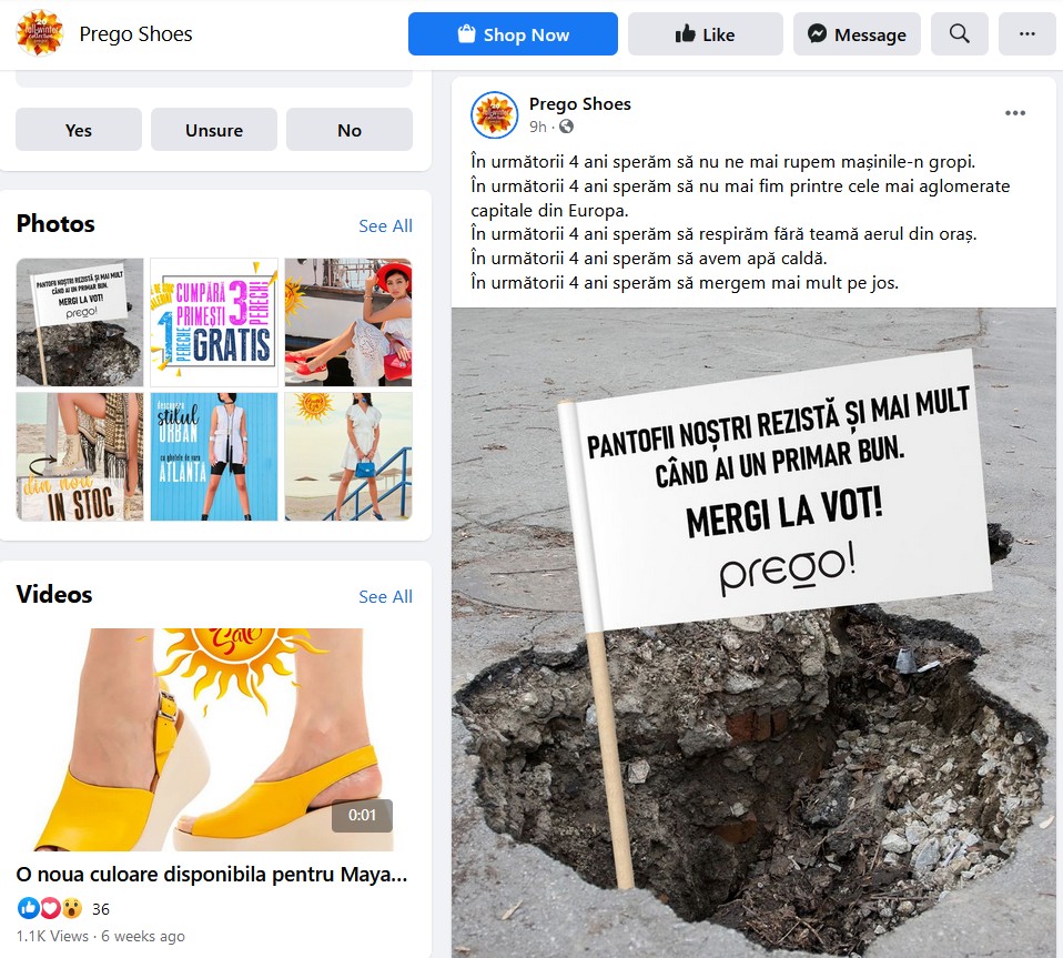 Un producător autohton de încălțămite transmite o serie de speranțe pentru perioada ce va urma alegerilor, ilustrând mesajele cu o fotografie sugestivă cu o groapă în asfalt: