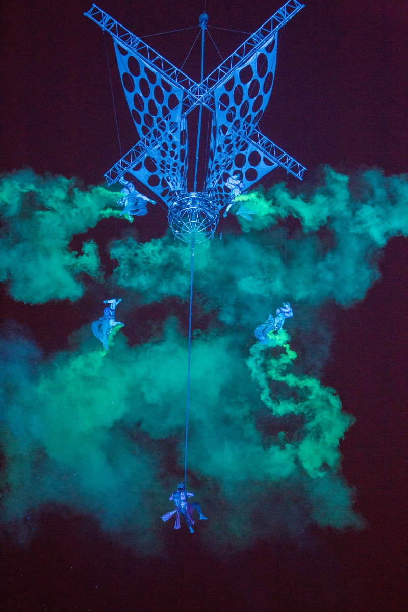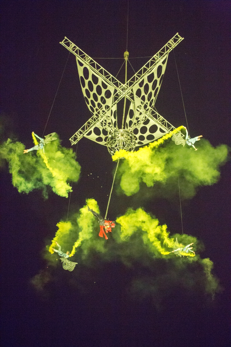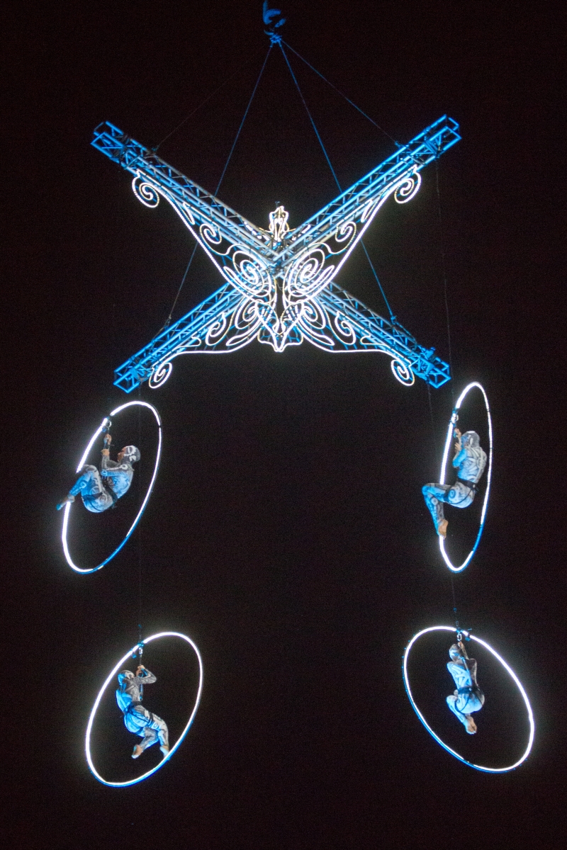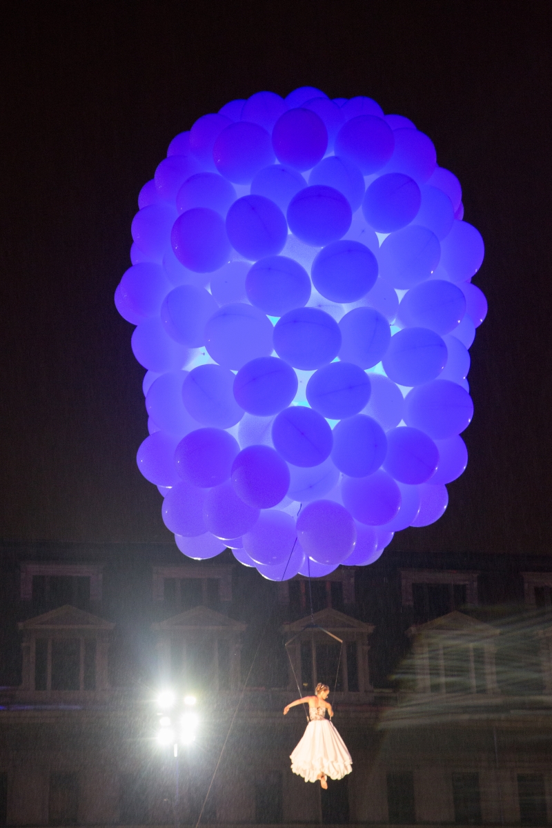 Reprezentațiile de seară animă peisajul bucureștean cu acrobați care dansează pe calcane luminate de proiecții 2D sau suspendați deasupra orașului, cu spectacole de lumină, jonglerii cu foc, personaje gigantice luminoase, reprezentații de tango, atmosferă de cabaret și costume spectaculoase.