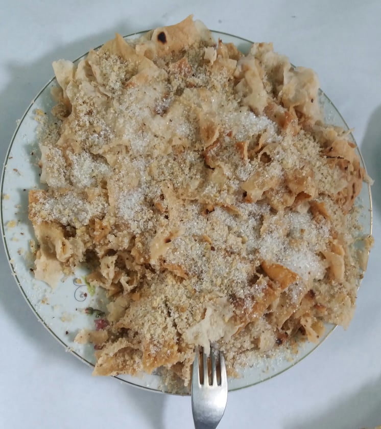 Peste ele se adaugă nucă, trasă prin mașină, amestecată cu zahăr din belșug și coajă rasă de lămâi. În final, se adaugă și zahăr vanilat. Se lasă puțin la răcit, la temperatura camerei și apoi se servesc.