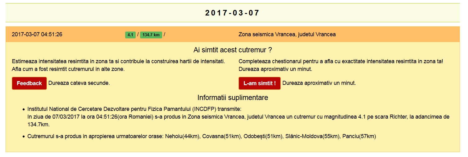 Potrivit Institutului Naţional de Cercetare-Dezvoltare pentru Fizica Pământului, seismul a fost înregistrat la o adâncime de 134,7 kilometri.