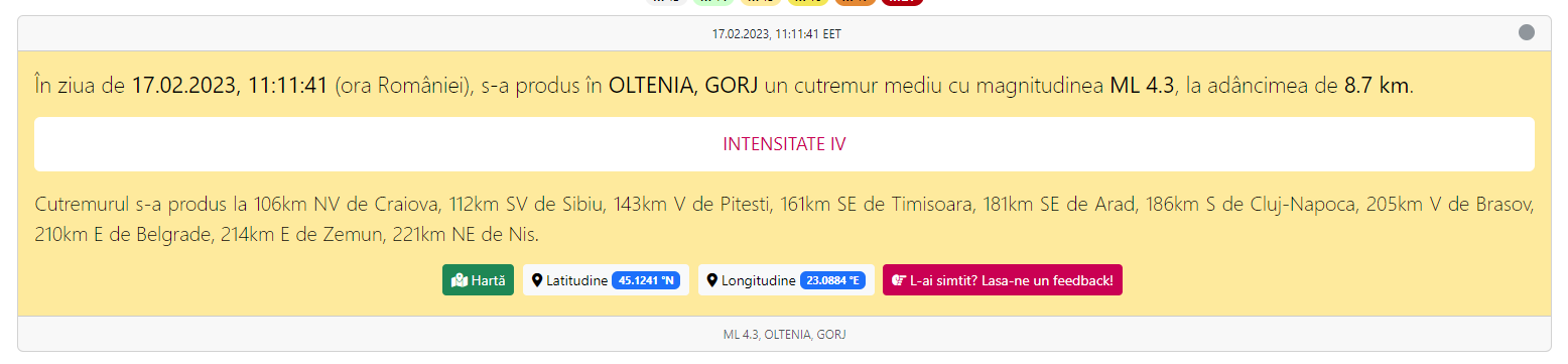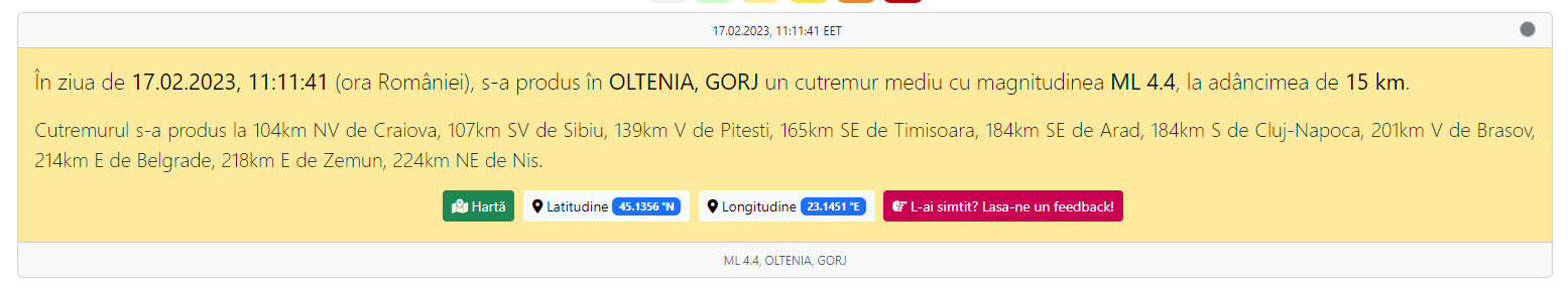 „În ziua de 17.02.2023, 11:11:41 (ora României), s-a produs în OLTENIA, GORJ un cutremur mediu cu magnitudinea ML 4.4, la adâncimea de 15 km. Cutremurul s-a produs la 104km NV de Craiova, 107km SV de Sibiu, 139km V de Pitesti, 165km SE de Timisoara, 184km SE de Arad, 184km S de Cluj-Napoca, 201km V de Brasov, 214km E de Belgrade, 218km E de Zemun, 224km NE de Nis”, transmite Institutul Naţional de Cercetare-Dezvoltare pentru Fizica Pământului – INCDFP.