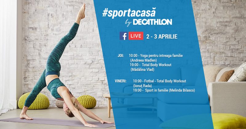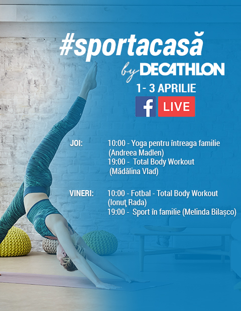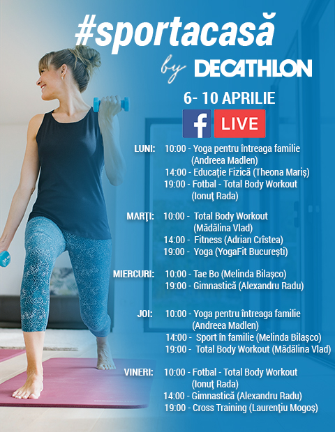 În următoarele săptămâni, Decathlon oferă sesiuni de sport live gratuite pe pagina de Facebook Decathlon Romania, susținute de antrenori profesioniști, pentru toți sportivii, de la mic la mare.