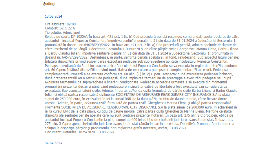 Soluția pe scurt: DP 1025/A/În baza art. 421 pct. 1 lit. b) Cod procedură penală, respinge, ca nefondat, apelul declarat de către apelantul – inculpat Popescu Constantin, împotriva sentinței penale nr. 51 din data de 31.01.2024 a Judecătoriei Sectorului 1, pronunțată în dosarul nr. 64678/299/2022. În baza art. 421 pct. 2 lit. a) Cod procedură penală, admite apelurile declarate de către Parchetul de pe lângă Judecătoria Sectorului 1 București și de către părțile civile Gherghescu Marina Elena, Barbu Liliana și Barbu Claudiu Iulian, împotriva sentinței penale nr. 51 din data de 31.01.2024 a Judecătoriei Sectorului 1, pronunțată în dosarul nr. 64678/299/2022. Desființează, în parte, sentința penală apelată și, în fond, rejudecând: