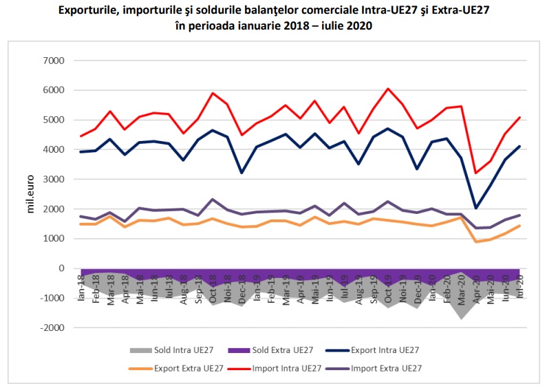 Astfel, în perioada 1 ianuarie-31 iulie 2020, exporturile însumat 34,1 miliarde de euro, iar importurile 44,1 miliarde de euro, rezultând un deficit de zece miliarde de euro, mai mare cu 481,4 milioane euro decât cel înregistrat în perioada similară din 2019.