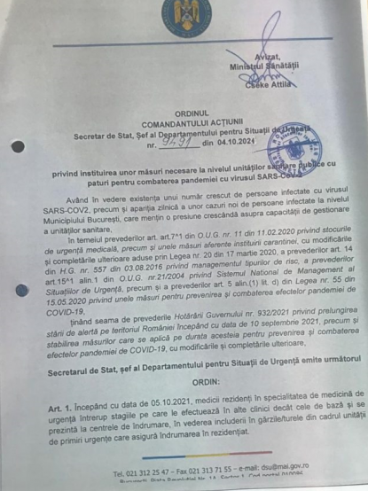 Potrivit unui Ordin al Comitetului național pentru Situații de Urgență, toți medicii rezidenți sunt chemați în spitale, începând cu data de 5 octombrie.