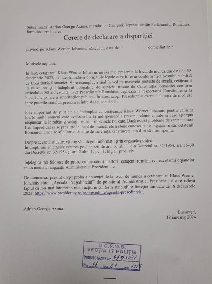 Opoziția – revoltată de neimplicarea preşedintelui Iohannis în problemele semnalate de tot mai mulți protestatari. Azi, deputatul Adrian Axinia a anunțat la Secţia 17 de Poliţie din Cotroceni dispariţia şefului statului şi chiar a obţinut număr de înregistrare pe cererea depusă.