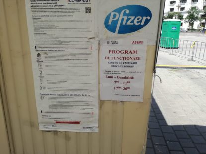 Hai și la celălalt container. Uite un program de funcționare. Zice așa: “Începând cu 1 iulie (cam când s-a dus vaccinarea în cap) programul zilnic al centrului este între 7 și 11 și 17 și 20”. Eu nu mă aflu în cele două intervale. Pe de altă parte, e de înțeles de ce s-a întâmplat așa. Oamenii nu mai vin să se vaccineze și cel puțin aici, nu se mai justifica un program de 13 ore.